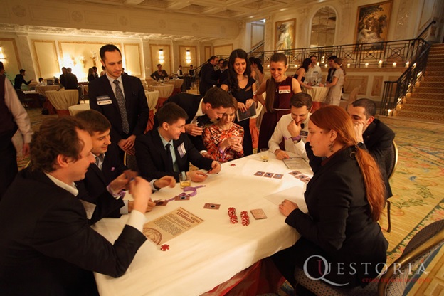 Секретные материалы”  – одна из самых популярных квесторий для корпоративов. Она уникальна тем, что в нее можно играть компанией в 150 человек! Скажем честно, она нам самим очень нравится: в ярко освещённом зале играет музыка, роскошные кавалеры в смокингах целуют ручки дамам в вечерних туалетах, азартные гости не отходят от игровых столов, ну и, конечно, вино и буфет… Сегодня мы решили на ее примере приоткрыть завесу тайны и рассказать, как мы готовим для вас игры.